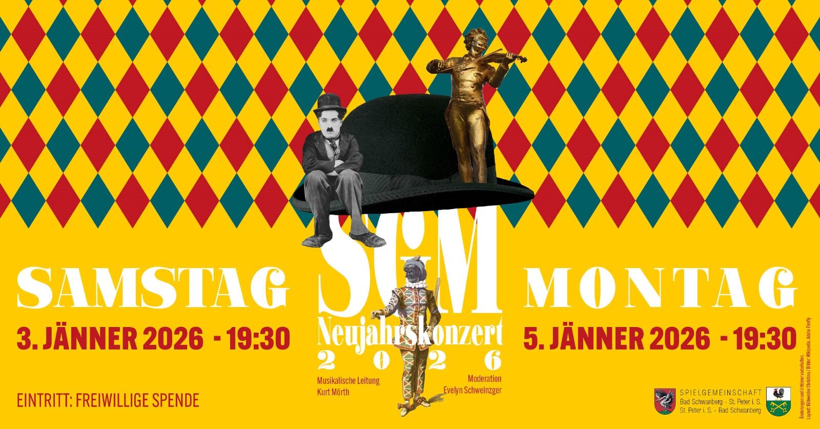 Wir laden zu unseren Neujahrskonzerten 2026 am 03. und 05. Jänner 2026. Beide Veranstaltungen finden in der BAD SCHWANBERGER HALLE statt.